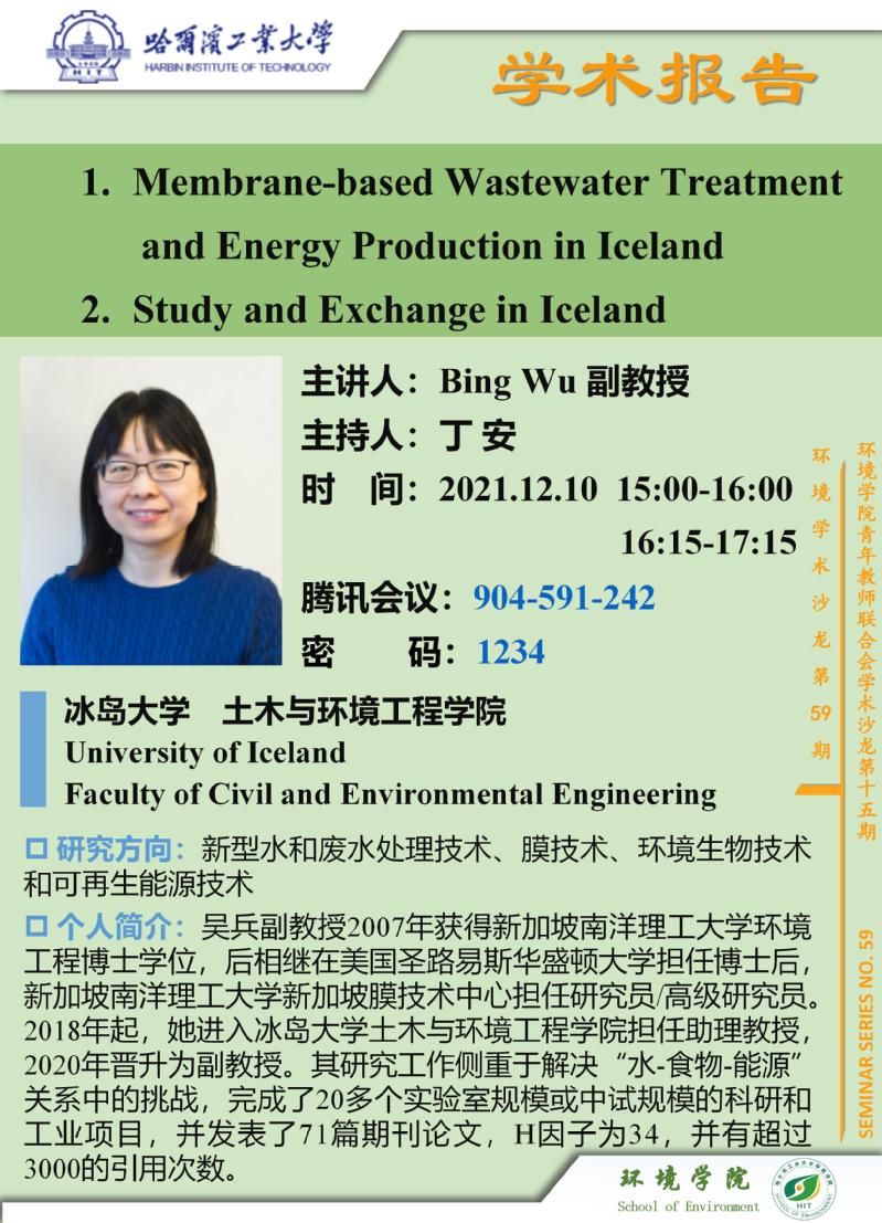 冰岛大学土木与环境工程学院Bing Wu副教授将于2021年12月10日与suncitygroup太阳集团师生进行学术交流,欢迎感兴趣的师生参加线上学术报告会。