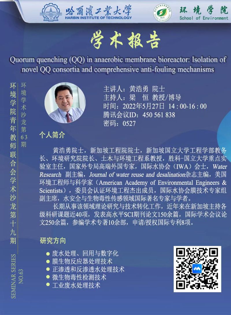 报告题目:Quorum quenching(QQ) in anaerobic membrane bioreactor: Isolation of novel QQ consortia and comprehensive anti-flouing mechanisms