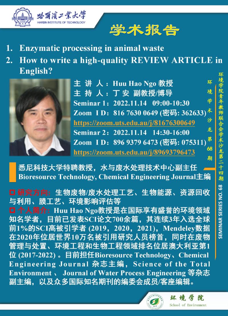 悉尼科技大学特聘教授,水与废水处理技术中心副主任,Bioresource Technology, Chemical Engineering Journal主编Huu Hao Ngo教授将于2022年11月14日与suncitygroup太阳集团师生进行学术交流,欢迎感兴趣的师生参加线上学术报告会。