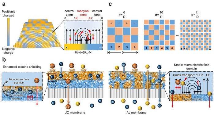 针对全球锂资源短缺问题,采用对锂离子具有高选择性分选的纳滤技术,有望实现锂电池废液中锂资源的经济、高效回收。然而,在锂回收过程中,常规的荷正电纳滤膜通常呈现出Janus电荷结构——即“表面为正电荷层-底面为负电荷层”(layer-by-layer)的特殊结构,会引起反离子在层间的过度积累,长周期运行过程中极易造成膜面正电荷层局部电场被抵消,导致钴、锰等二价离子穿透纳滤膜,进而使得锂离子的分离效能低下,即所谓的“静电屏蔽”效应。