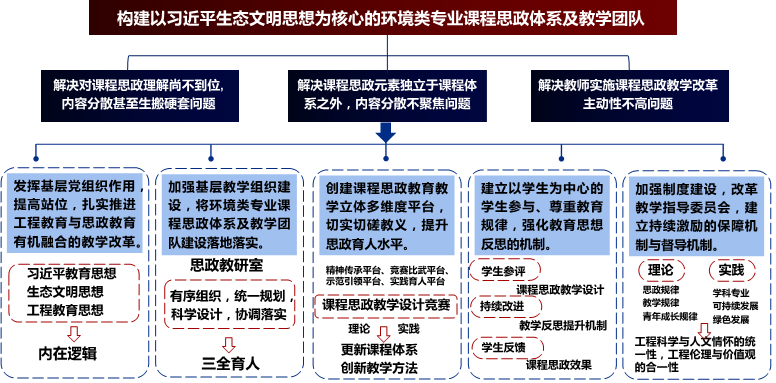 团队在理论上遵循思政规律、教学规律和青年成长规律,实践上体现学科专业与可持续发展观及绿色发展理念的契合性、工程科学与人文情怀的统一性,工程伦理与价值观的合一性。出台了系列激励政策,以及持续改进的督导机制,注重营造利于调动各方积极性的氛围和环境。